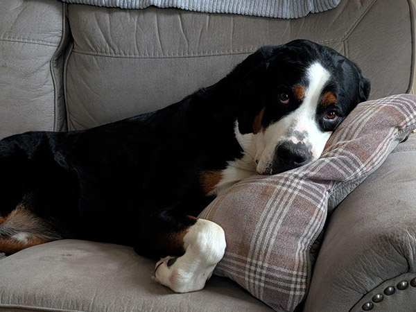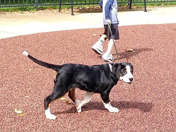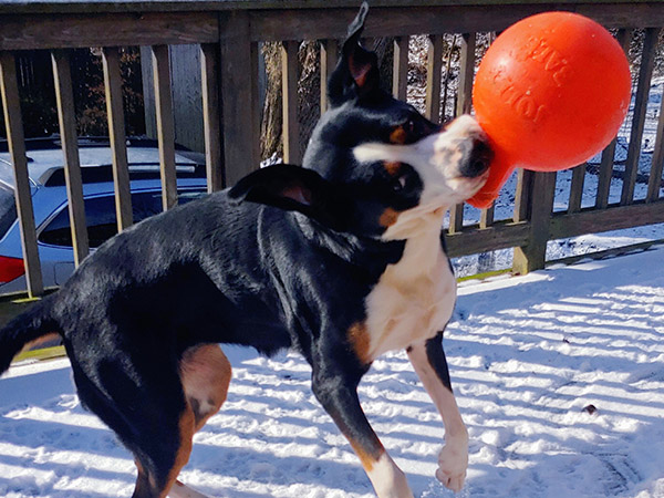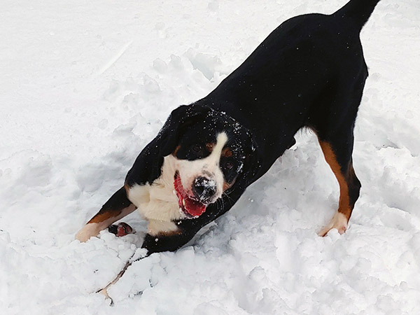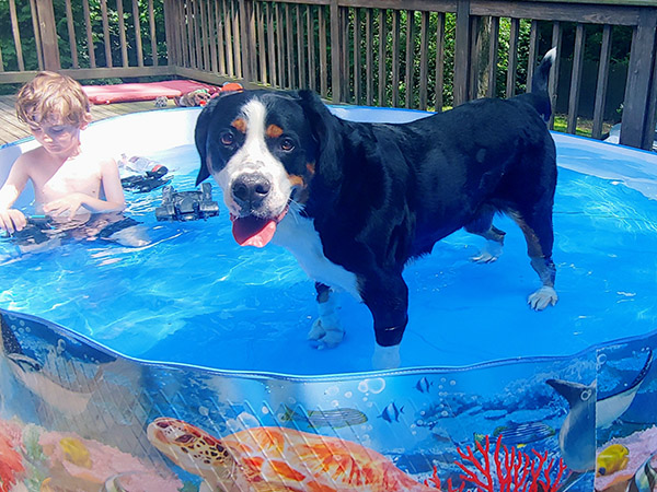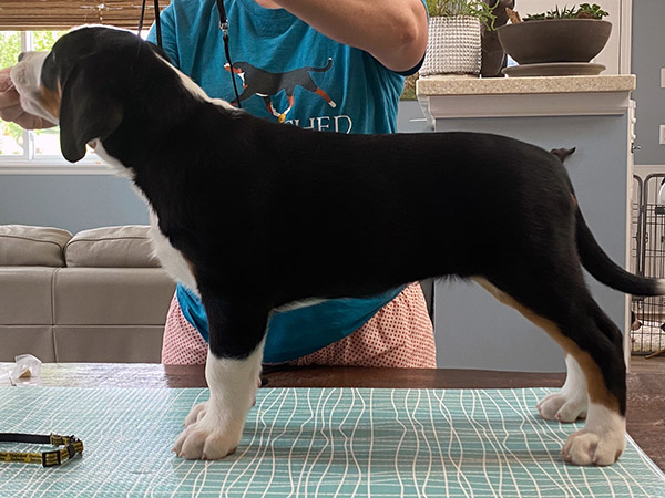 Cairde is an honorary "Irish" swissy with a translation to match her namesake litter, "Friends." This is quite apropos, as she has never met a stranger and greets all with enthusiasm and delight. She resides in Ohio with Beau, Erin, and big brother, Finnegan, where she performs the ever practical tasks as foot warming, kindling collecting, disposer of strawberry tops, and serenading the neighborhood with loud baroos. It's a tough job, but she's rewarded with plenty of car rides, hikes, creek stomps, and a round of fetch-the-toy-by-name when the mood strikes.